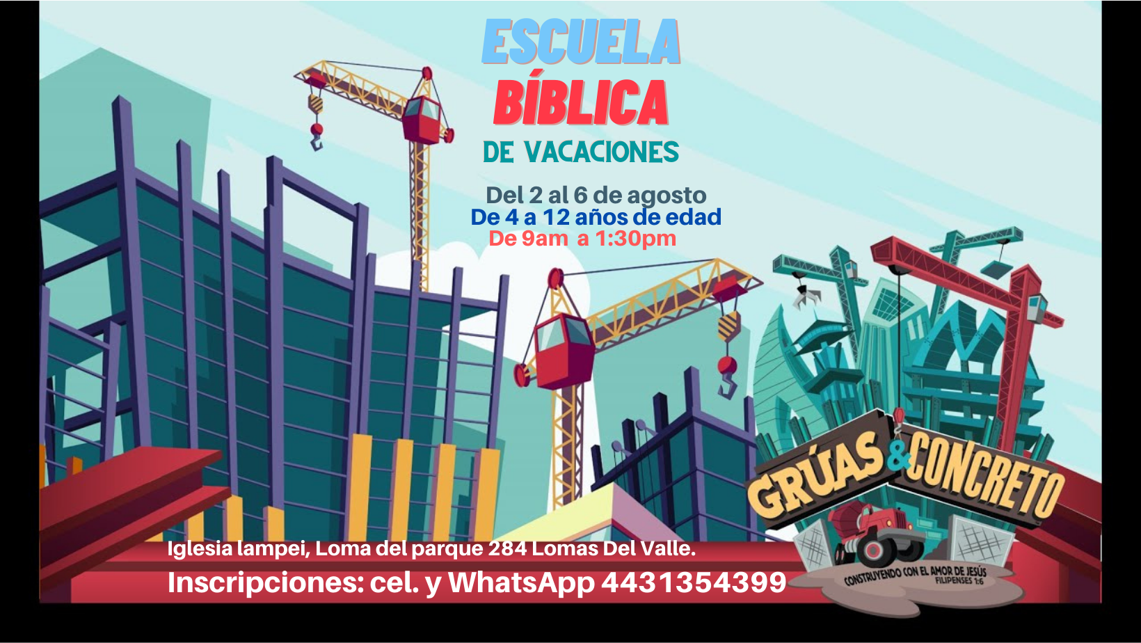 Esculita bíblica de vacaciones donde habrá música, clases dinámicas, inglés y mucha diversión. Para niños de 4 a 12 años